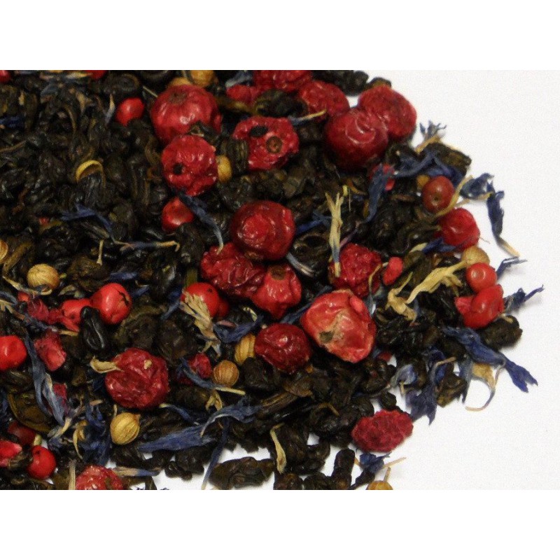 Ingredienti: tè verde special Gunpowder, aroma naturale, pepe rosa, ribes rosso bacche, coriandolo, lampone pezzetti e fiordaliso.